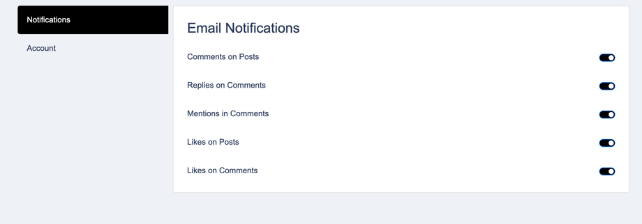 From here, you can update your email notifications, stay informed and updated with any newly published posts, likes or new comments; or even update your theme settings from the 'Account' tab, by changing your 'Light Theme', (default white background to dark one). You may refer to the screenshot below, for illustrative purposes.