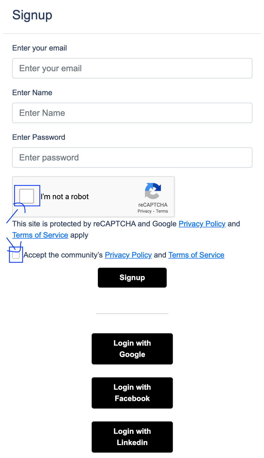 Kindly ensure that all fields, such as your email, full name (= name) and password, along with the reCAPTCHA and "Accept the community's Privacy Policy and Terms of Service" boxes are ticked respectively; prior to clicking/tapping on the 'Sign up' button.