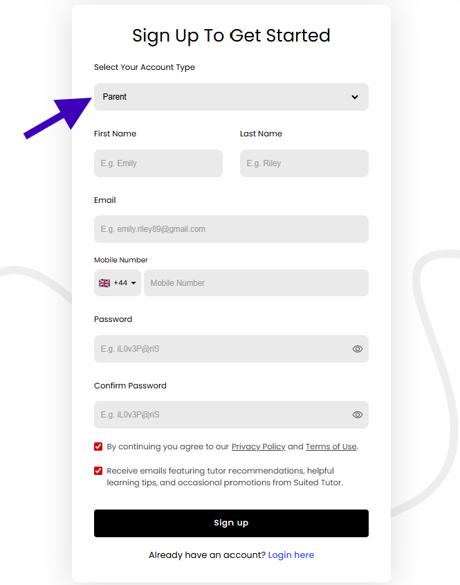 Start Fresh: Head to our sign up page and select ‘Parent’ as your account type.