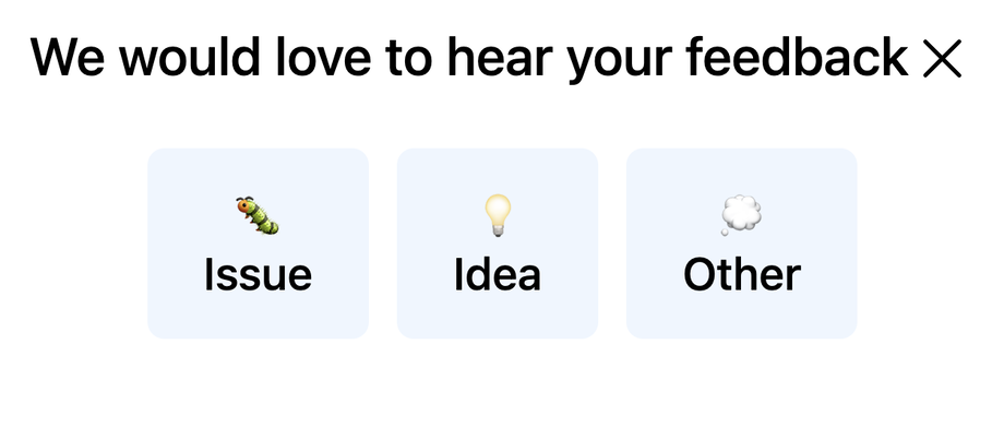 Then, choose the relevant category, such as 'Issue,' 'Idea,' or 'Other'. (Screenshot attached for your convenience).