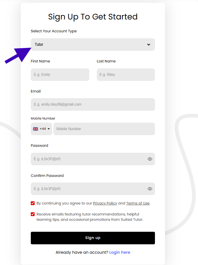 👉 If you are here to teach and inspire, please make sure to select the ‘Tutor’ account type, during your registration. (A sample sign up screenshot is included below for your reference):