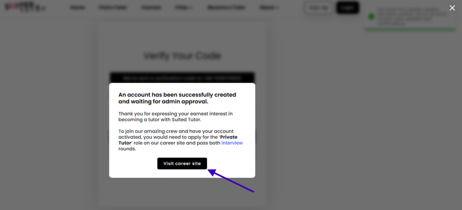 - You will see a pop-up message confirming your details and guiding you to take the next step. (In addition, you will be prompted to visit our Careers Site and apply for the ‘Private Tutor’ role. A visual has been enclosed beneath for your ease).