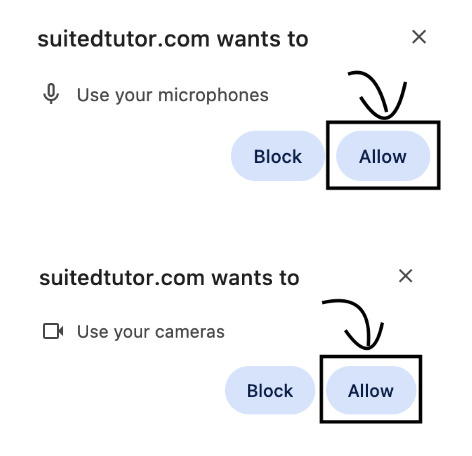- Enable Permissions: Before you begin your virtual session, you'll need to enable from your currently open browser, e.g. Google Chrome, your 'camera' and 'microphone' prompts, by simply selecting the "allow" button. This step ensures that you're visible and audible to your students.