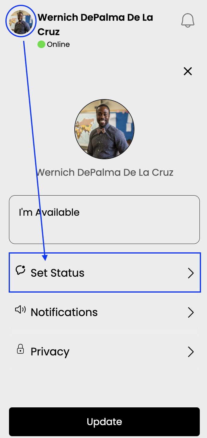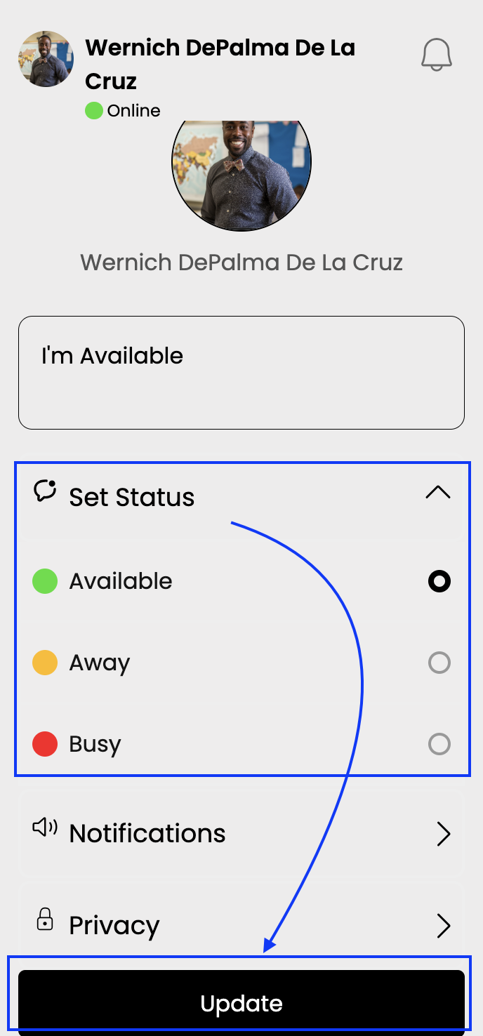 - Step 3: If you want to enable notifications to stay updated and keep track of conversations, please go to your profile, and below the 'Set Status' option, find 'Notifications.' From the dropdown, tick (✔️) the ''Sound Notifications'' and ''Popup Notifications'', and please don't forget to select/click the "Update" button.